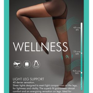 Designed to exert medium compression on the legs, for lightness and vitality. The superb fit guarantees utmost comfort. Ideal for anyone who spends a lot of time standing or for travelling. Sheer, 40 denier, reinforced body and toe, flat seams and cotton gusset.