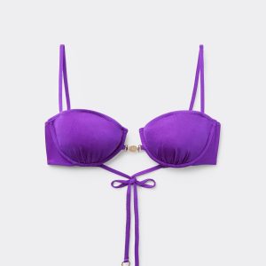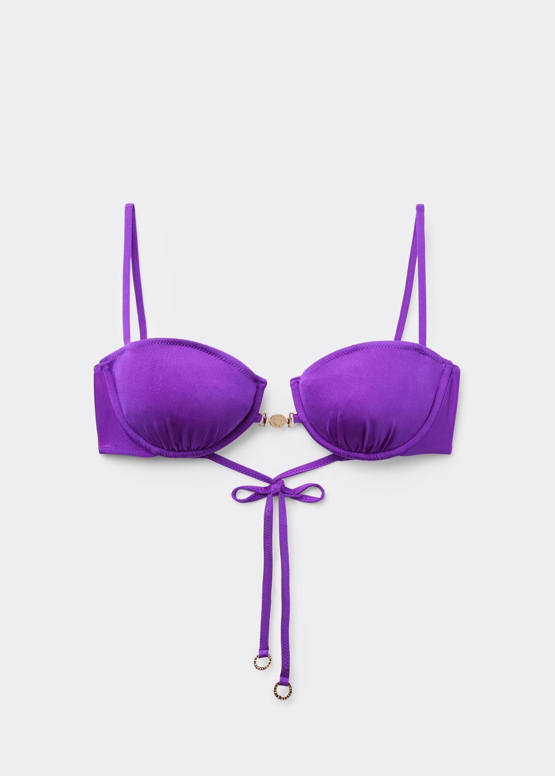 Unpadded balconette swimsuit top with underwire, featuring a minimal fit that exalts the silhouette with a touch of sensuality and refinement. The bright silk-effect fabric embellished by elegant golden details radiates a sophisticated sensation of discrete luxury. Adjustable shoulder straps and string tie fastening complete the design for this summer look that does not pass by unnoticed.