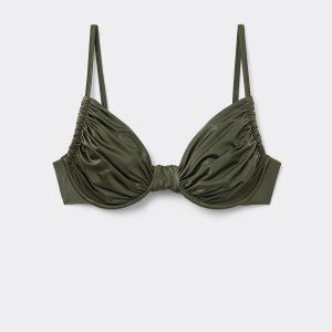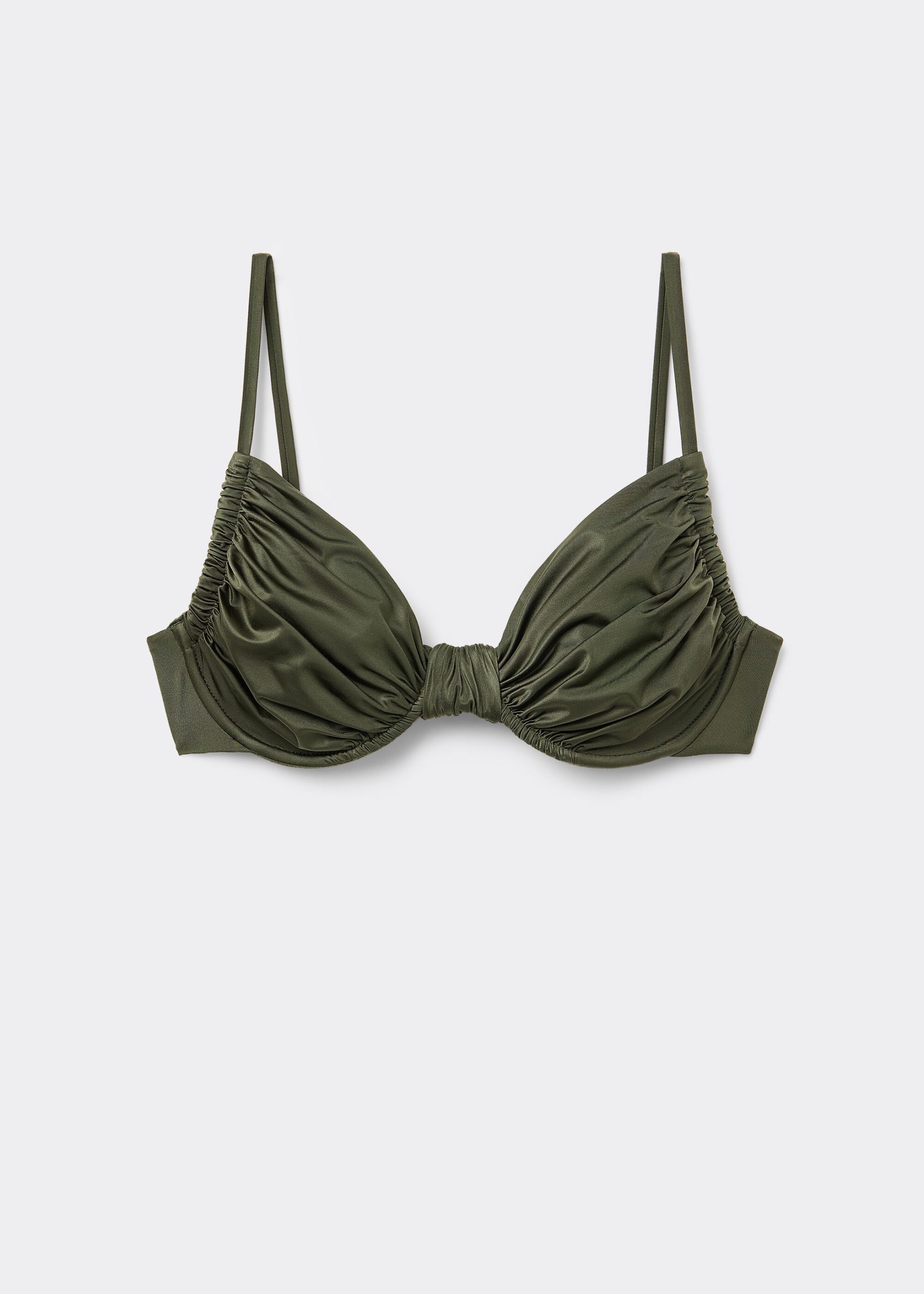 Unpadded balconette bikini top with underwire. The structure of the cups perfectly embrace and support the bust, thanks to the side drawstring on the cups that can also adjust the fit. Ideal for the larger bust. The style features a bright fabric with a silky effect, embellished by ruffles and gold tips. Adjustable straps and hook closure with two adjusters.