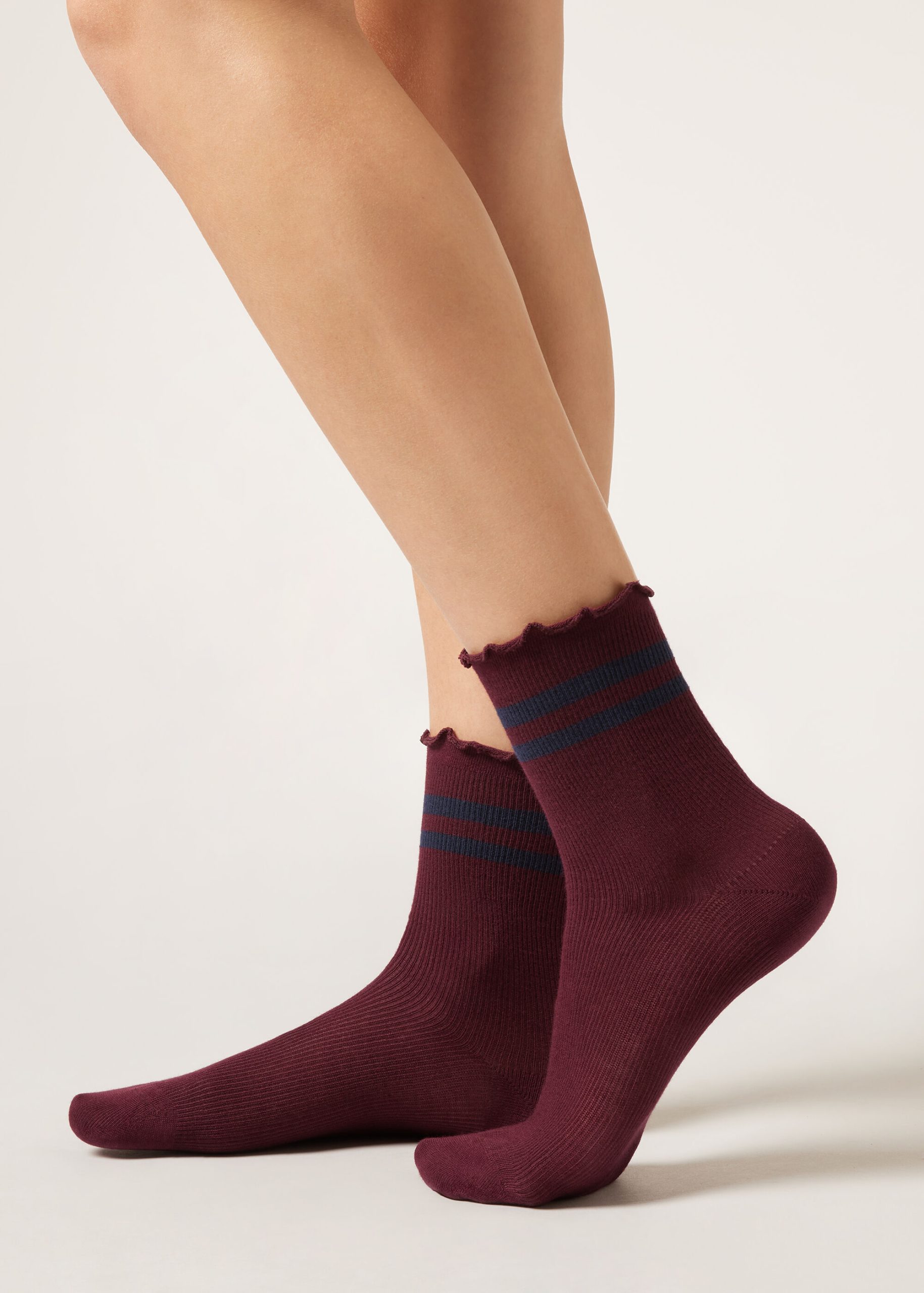 Women’s short socks in soft cotton. The micro-ribbing offers a refined touch and right amount of stretch. The romantic edge and contrasting color bands add a subtle and feminine originality.