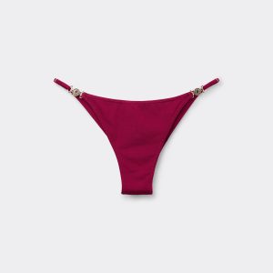 Brazilian bikini bottoms with adjustable side panels, featuring a minimal fit that exalts the silhouette with a touch of sensuality and refinement. The slightly rounded waist at the front allows for both a regular and more high-cut fit, depending on one’s physique. The bright silk-effect fabric embellished by elegant golden details radiates a sophisticated sensation of discrete luxury. Fully lined with invisible seams.