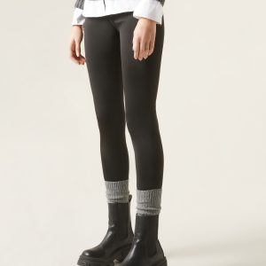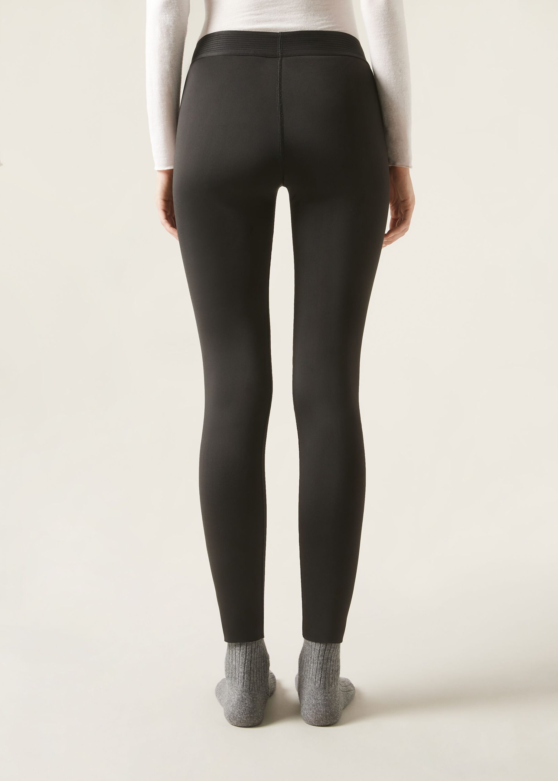 Thermal leggings made in double faced fabric. On one side the texture appears uniform and smooth, on the other it is especially soft and slightly fuzzy: the double faced fabric lets you wear them on either side. Comfortable waistband.