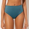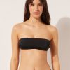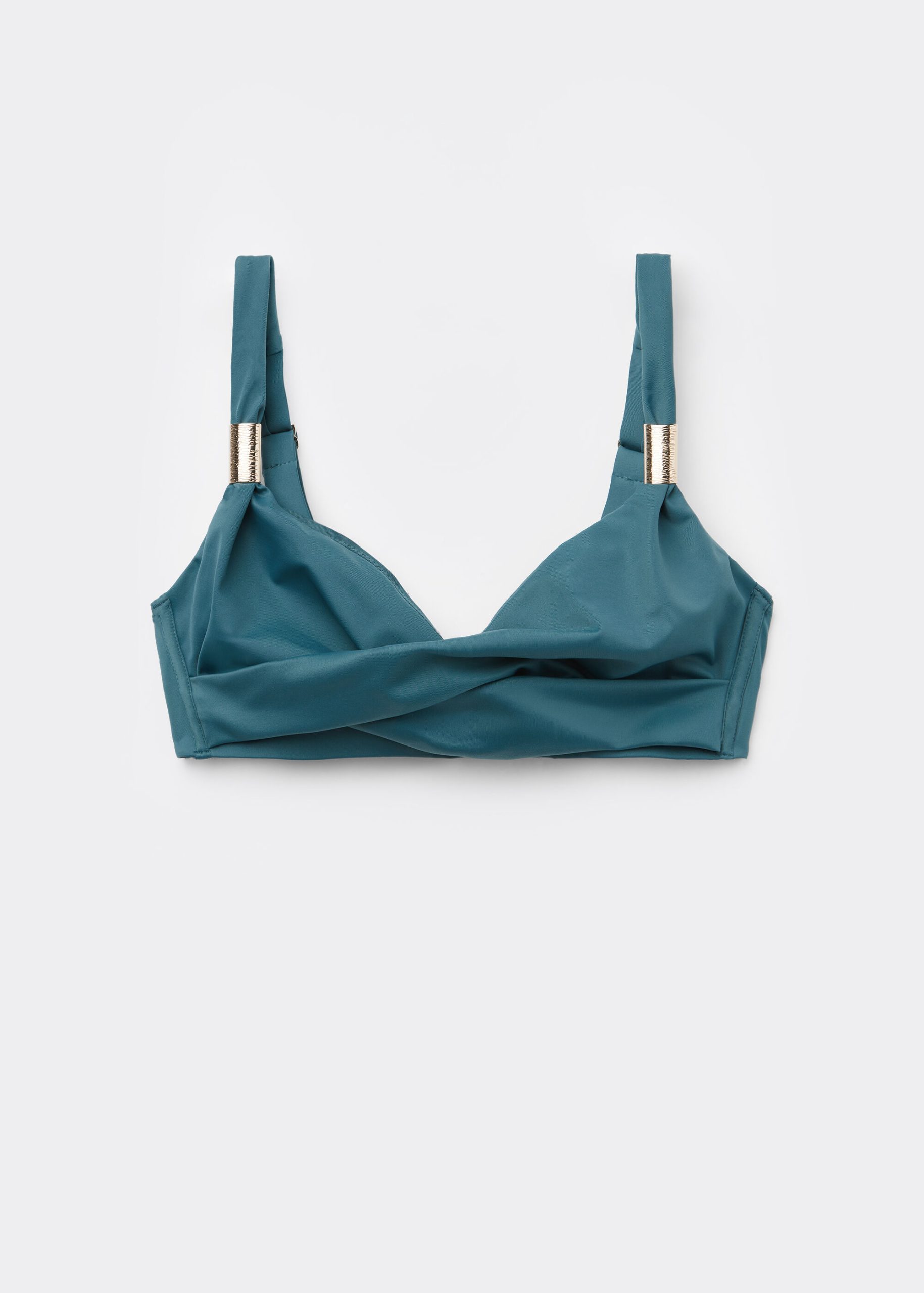 Triangle style bikini top, wireless and unpadded for a natural effect. The structure of the cups and the wide fit at the sides provide good support for larger busts. The compact fabric, designed to exalt and enhance the body’s curves, ensures excellent support and is studied to make every woman feel at ease without constraint. The center gore features draping in the middle and golden accessories that exalt its elegance. Adjustable shoulder straps. Back closure with two hook-and-eye closures to improve the fit of the underband.