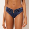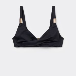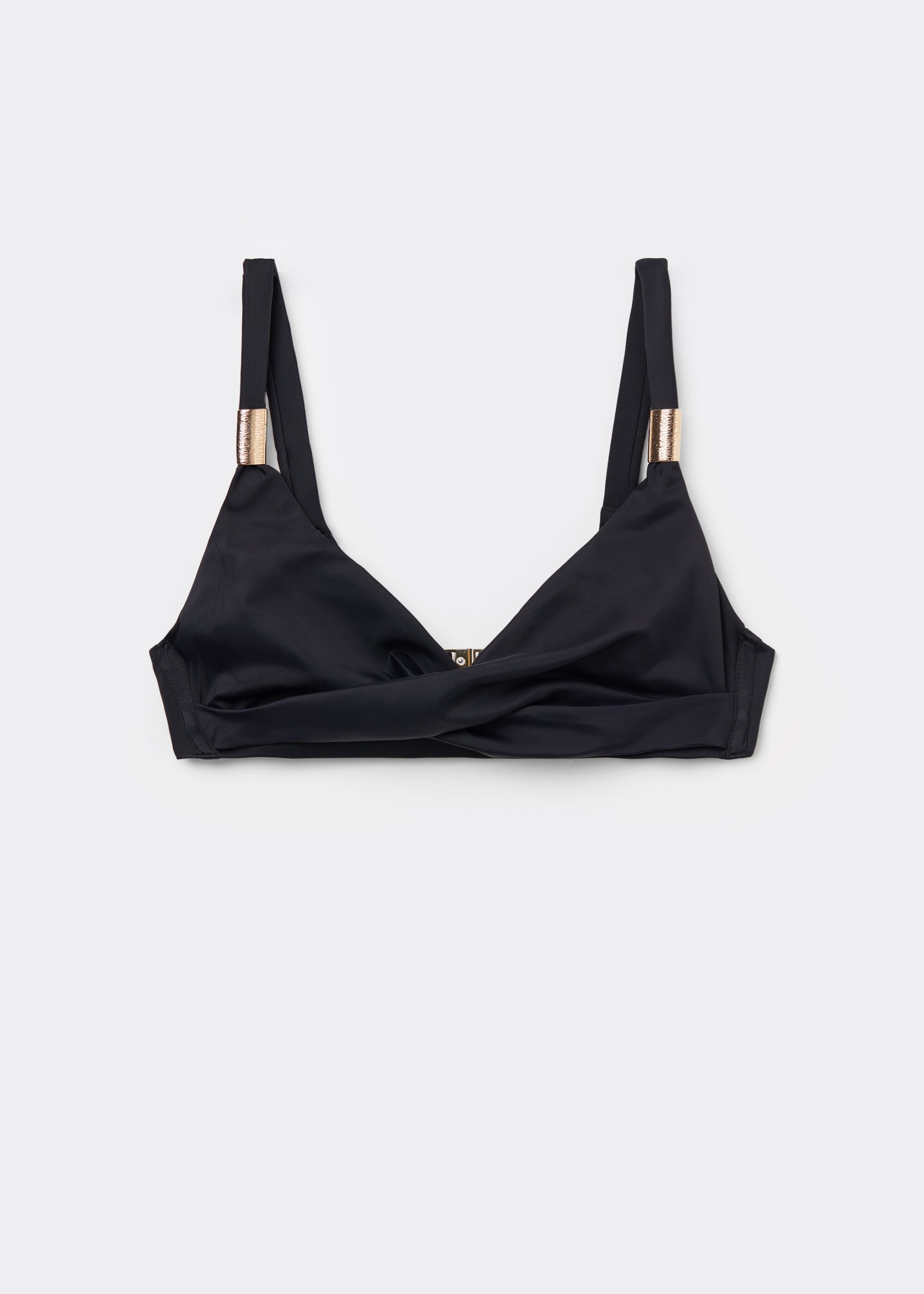 Triangle style bikini top, wireless and unpadded for a natural effect. The structure of the cups and the wide fit at the sides provide good support for larger busts. The compact fabric, designed to exalt and enhance the body’s curves, ensures excellent support and is studied to make every woman feel at ease without constraint. The center gore features draping in the middle and golden accessories that exalt its elegance. Adjustable shoulder straps. Back closure with two hook-and-eye closures to improve the fit of the underband.