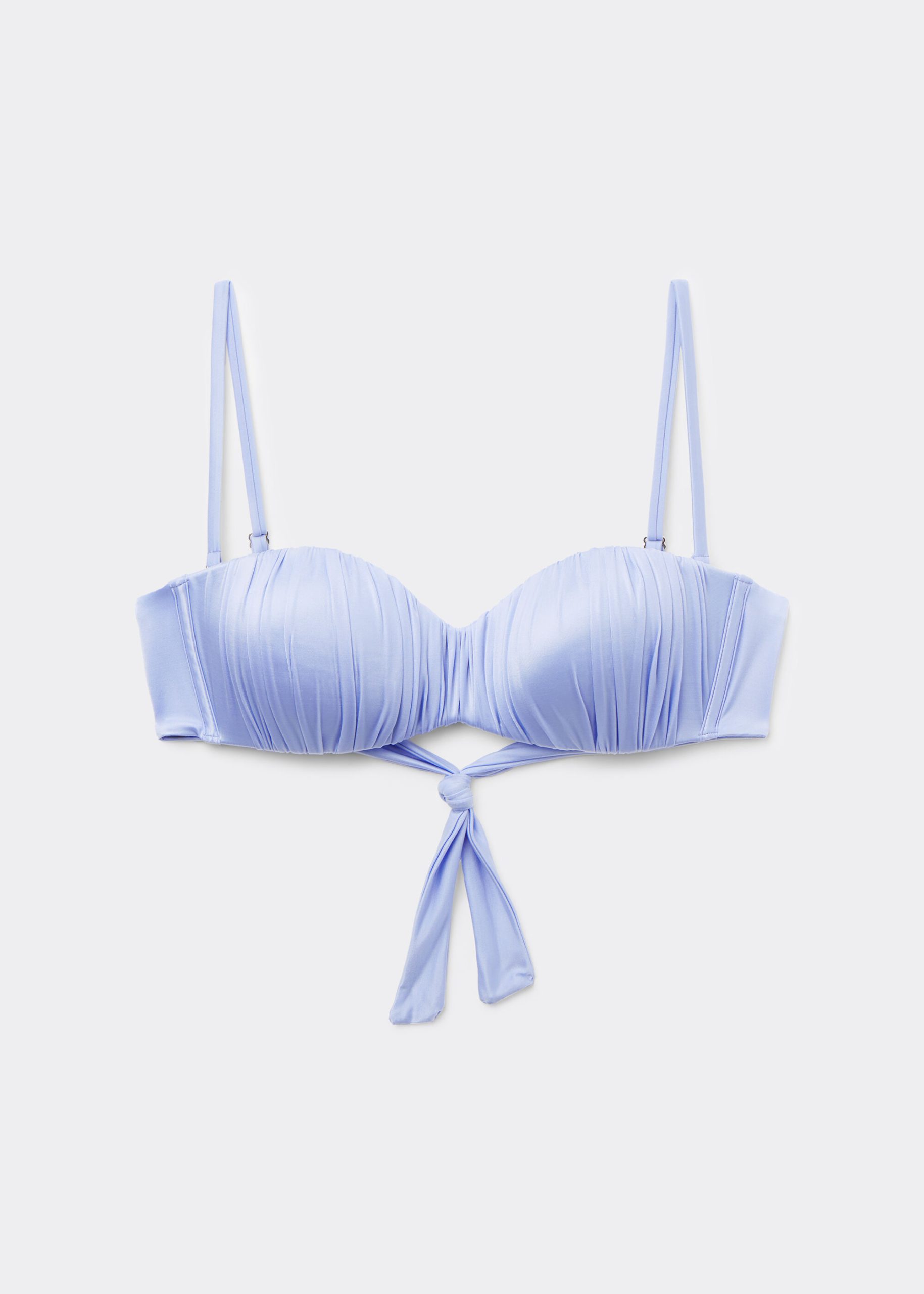 Bandeau bikini top with underwire, graduated padding cups, and side boning to guarantee good support, perfect for those with larger busts. The style features a bright fabric with a silky effect with ruffles. Adjustable and removable straps. Back tie closure.