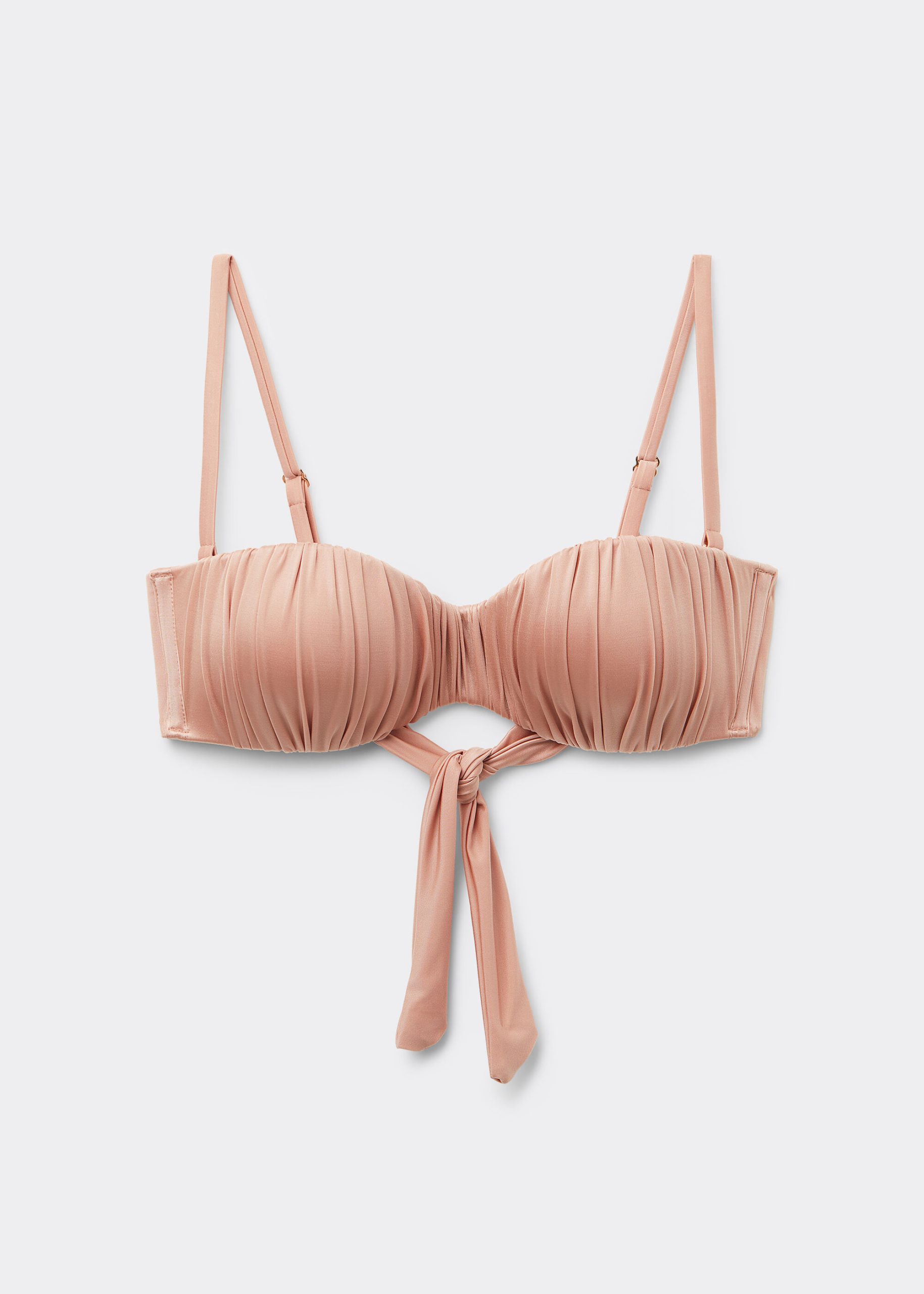 Bandeau bikini top with underwire, graduated padding cups, and side boning to guarantee good support, perfect for those with larger busts. The style features a bright fabric with a silky effect with ruffles. Adjustable and removable straps. Back tie closure.