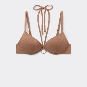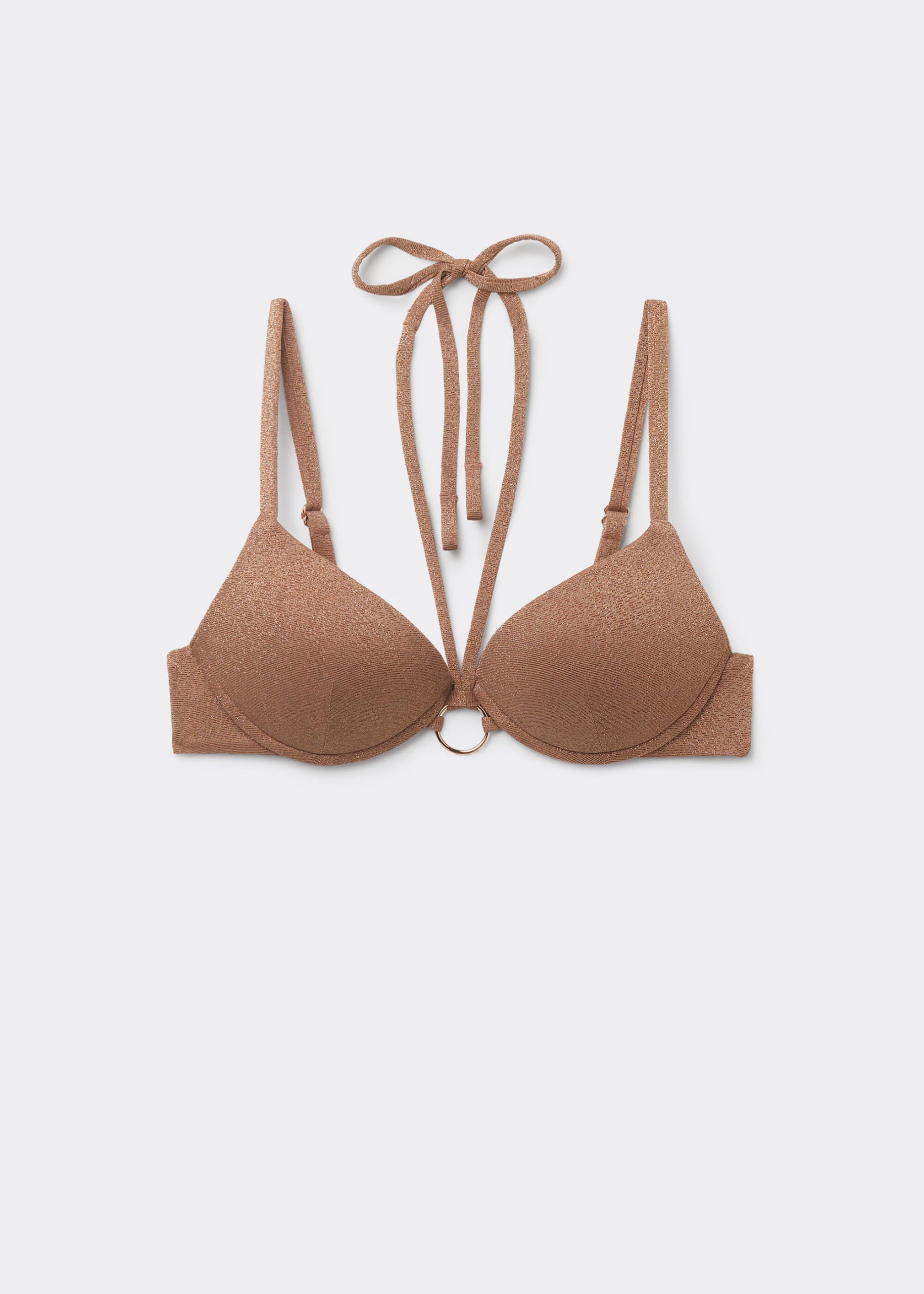 Push-up bikini top with graduated padding and underwire for more volume at the bust. Soft fabric with shiny lamé thread embellished with nickel free small gold rings. Adjustable straps and back hook closure.