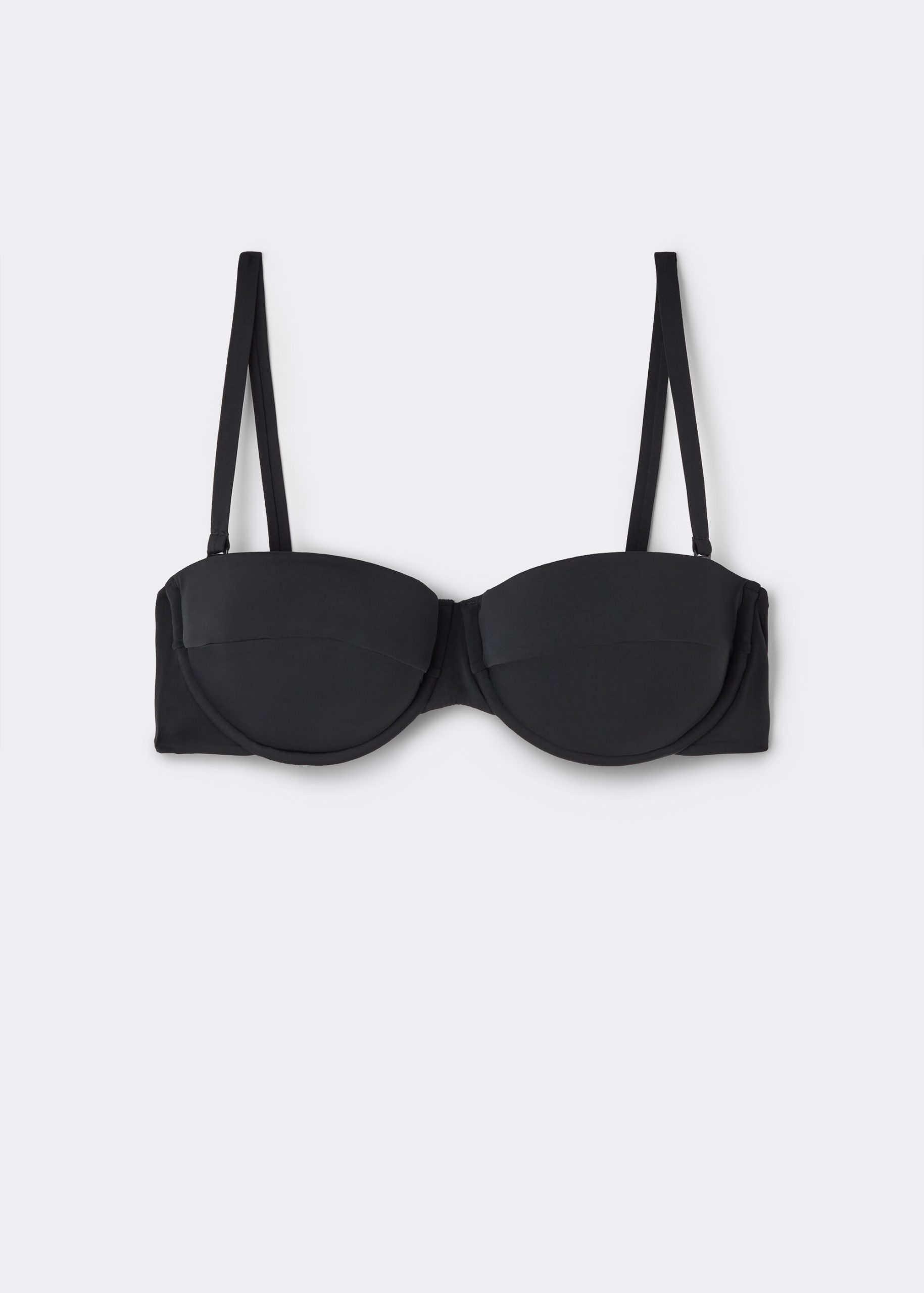 The lightly padded strapless bikini top blends elegance with functionality, making it a must-have balconette bikini. Designed with lightly padded cups and underwire, it provides gentle lift and shaping, offering support and a defined silhouette. The structured balconette style is perfect for sunbathing, ensuring no tan lines while delivering a secure and flattering fit. A unique cut-out detail on the cups adds a modern touch, elevating the design. Crafted from ultra-soft fabric, it feels breathable and light on the skin, even during long beach days. The versatile design features removable straps for added styling options—wear them for extra support or go strapless for a sleek, streamlined look. A two-hook-and-eye back closure ensures the underband stays comfortably in place while allowing for adjustability. This strapless balconette bikini is ideal for anyone seeking chic swimwear that offers both style and support for any summer adventure.