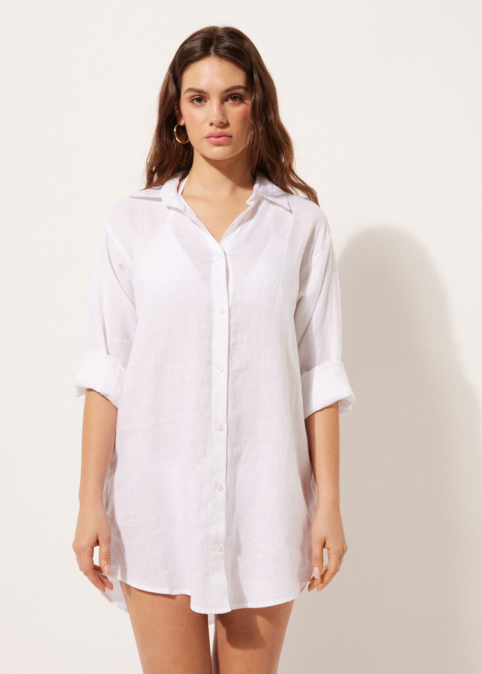 Button up shirtdress in linen for those who love natural fibers, with lapel collar and long sleeves. Above-the-knee length.