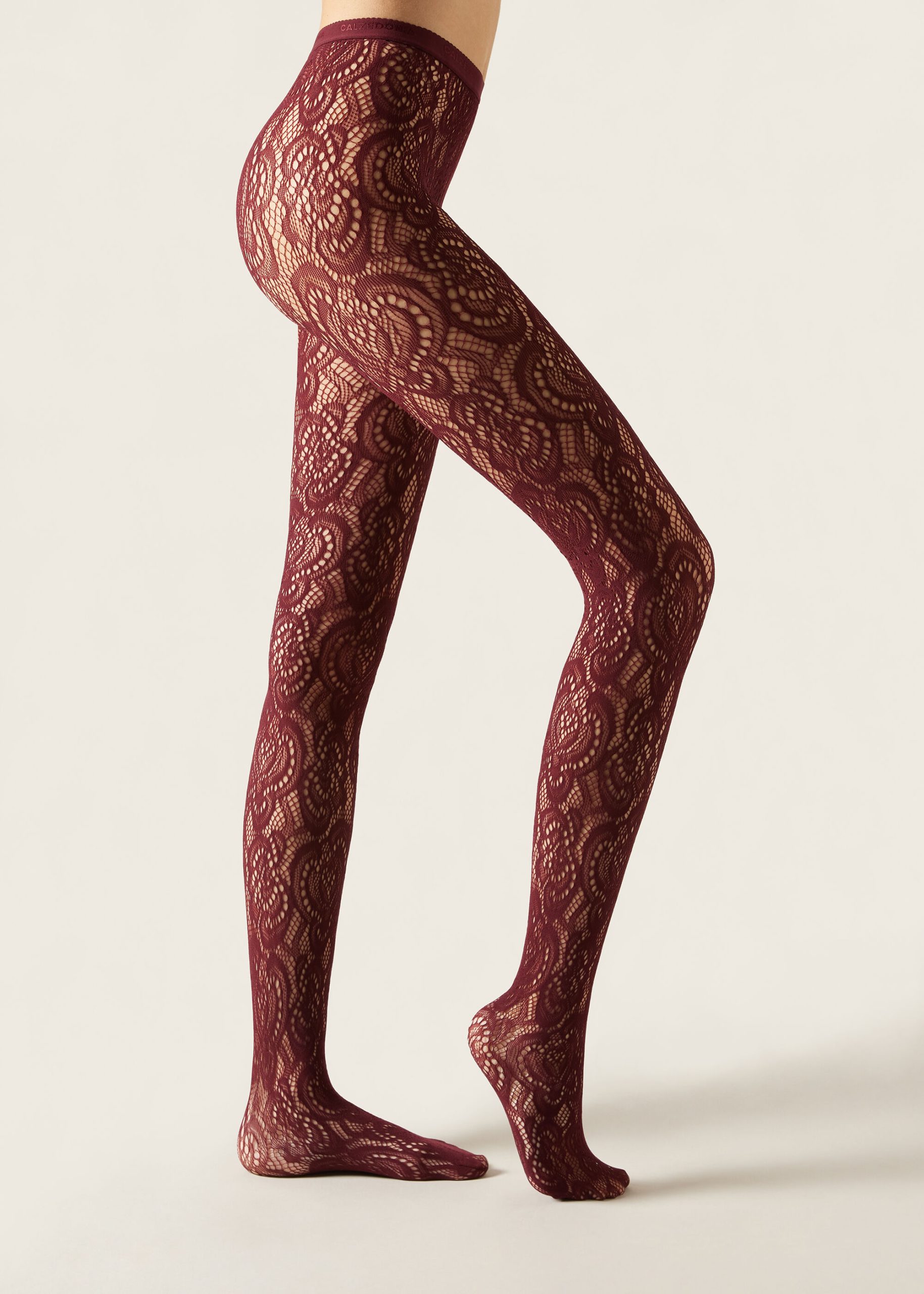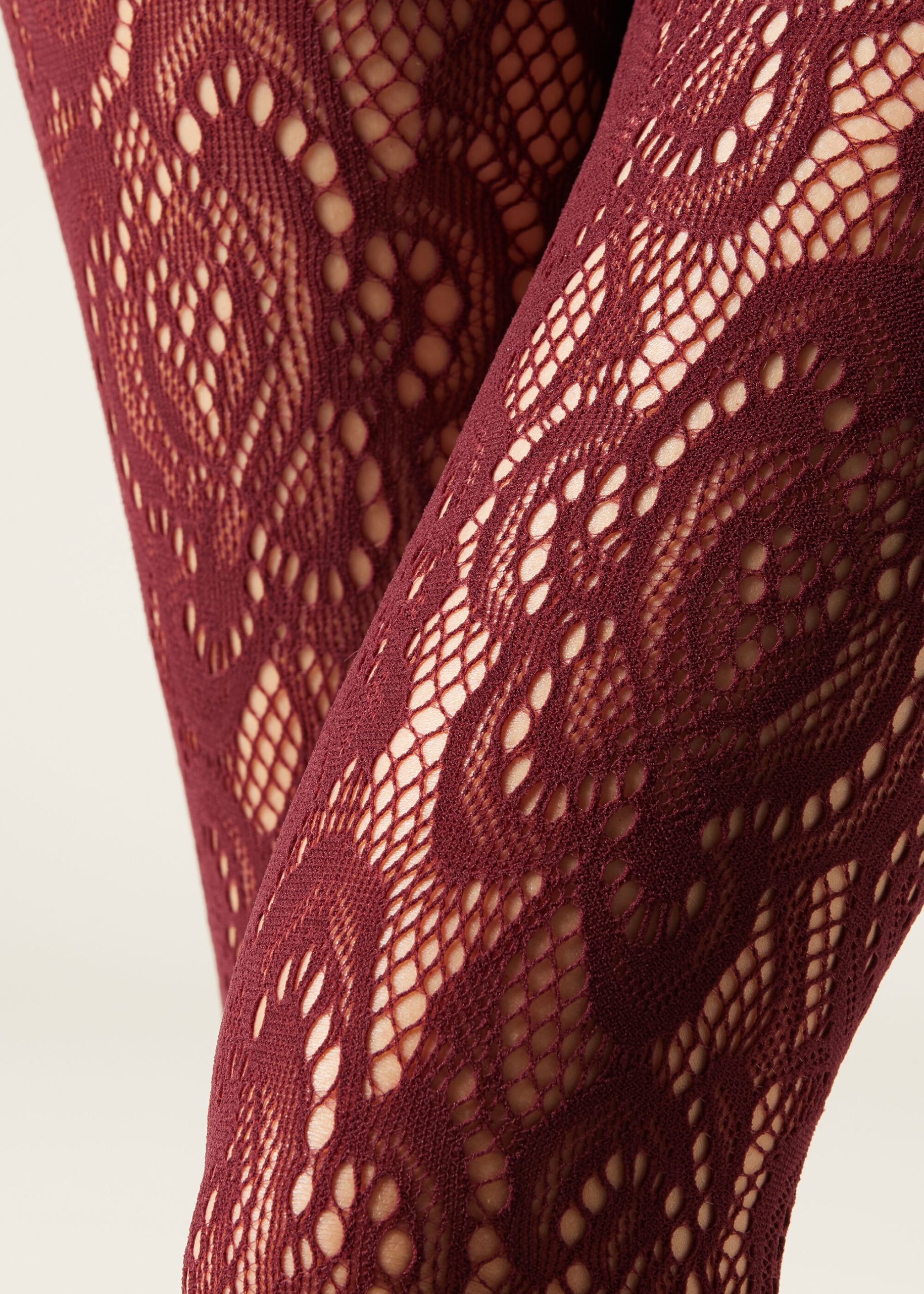Women’s fishnet tights embellished with an opaque floral motif with a macramé lace effect.