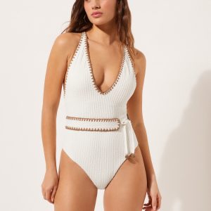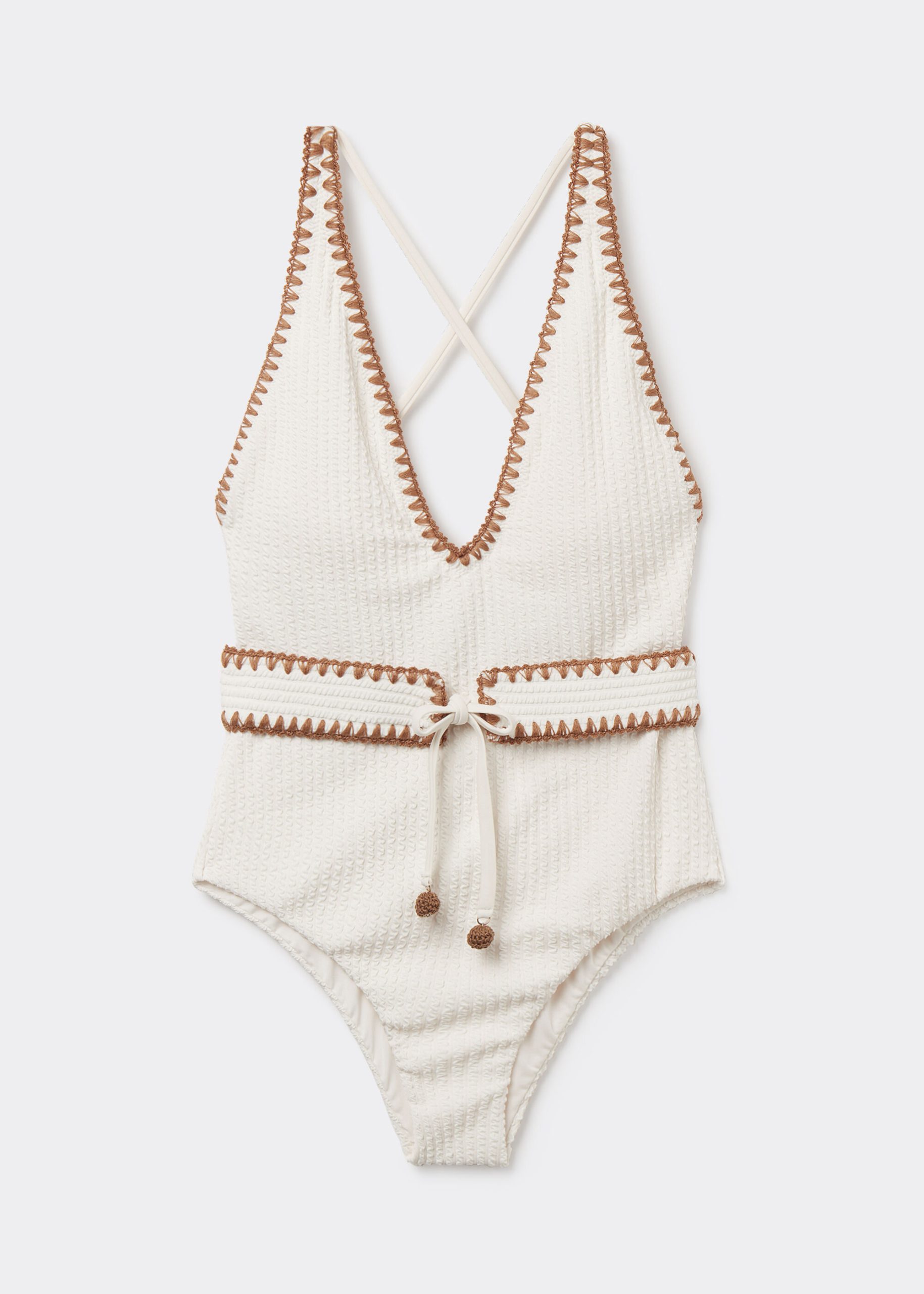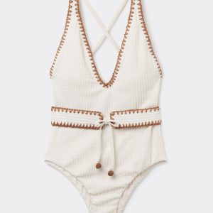 This stylish woven swimsuit conjures classic summer vacations by combining neutral tones in a gloriously rustic design, while the contrast hem draws the eye to your decolletage and waist in a tasteful and subtle way. The cross back one piece swimsuit design is ideal for maximizing your tanning while creating a sultry and romantic effect. The lightweight waist belt adds visual interest while also offering a slight cinch that breaks up your profile and creates a softer and more feminine silhouette. This versatile one piece swimsuit with belt allows you to position your waist tie in a variety of ways, from a coquettish and playful side tie to a more practical and straightforward cinch. However you choose to wear this backless one piece swimsuit, you will be evoking the classic vacation glamour of the 1950s in a soft color palette that perfectly complements tanned skin and the soft terracotta of poolside tile and holiday villas.