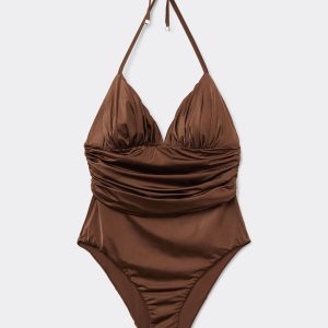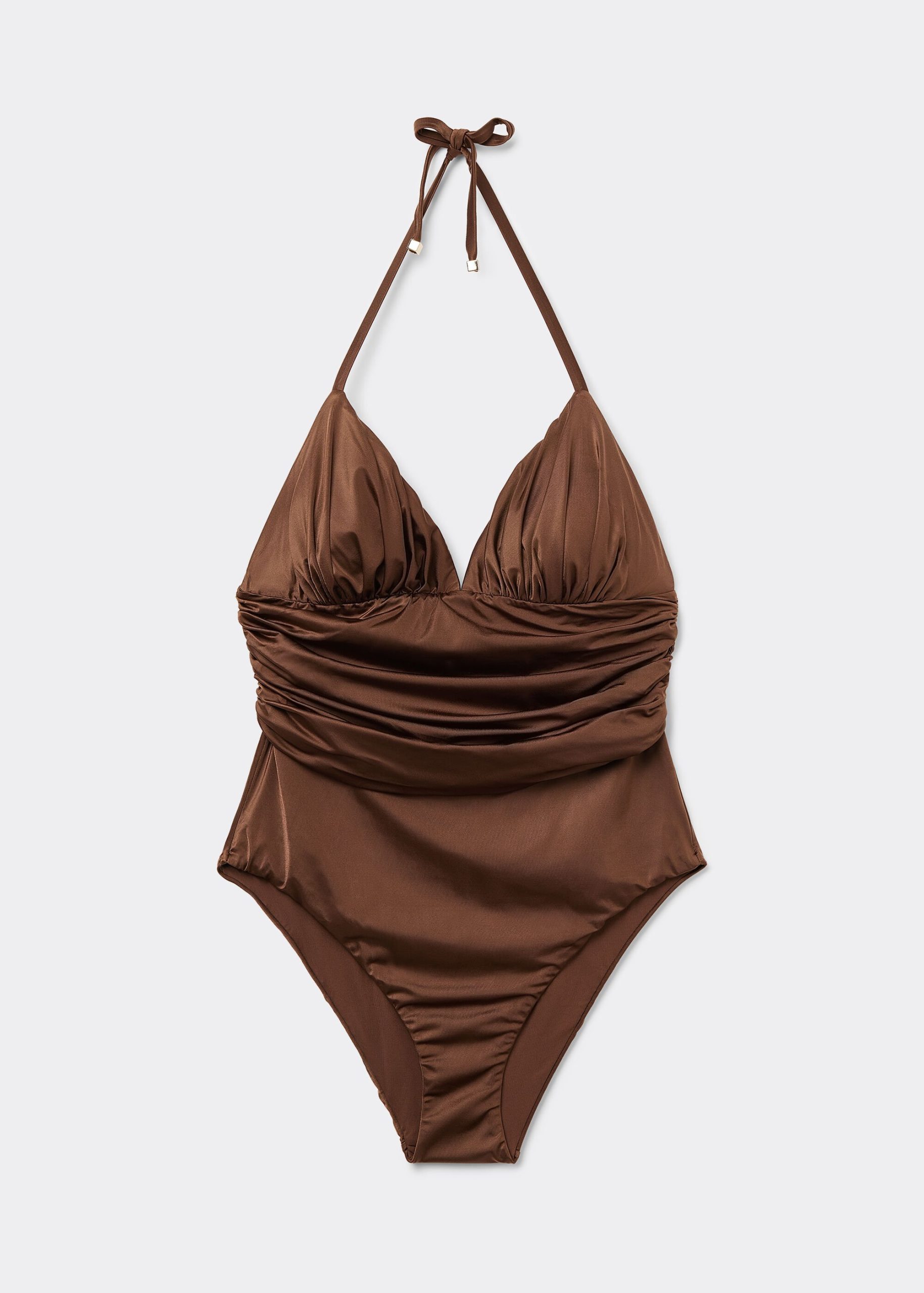 Wireless one piece swimsuit with deep neckline and light removable padding. Made of bright fabric with a silk effect, embellished with elegant ruching. Adjustable thin straps. Fully lined in back with invisible seams. Regular bottoms coverage in back.