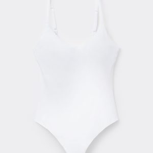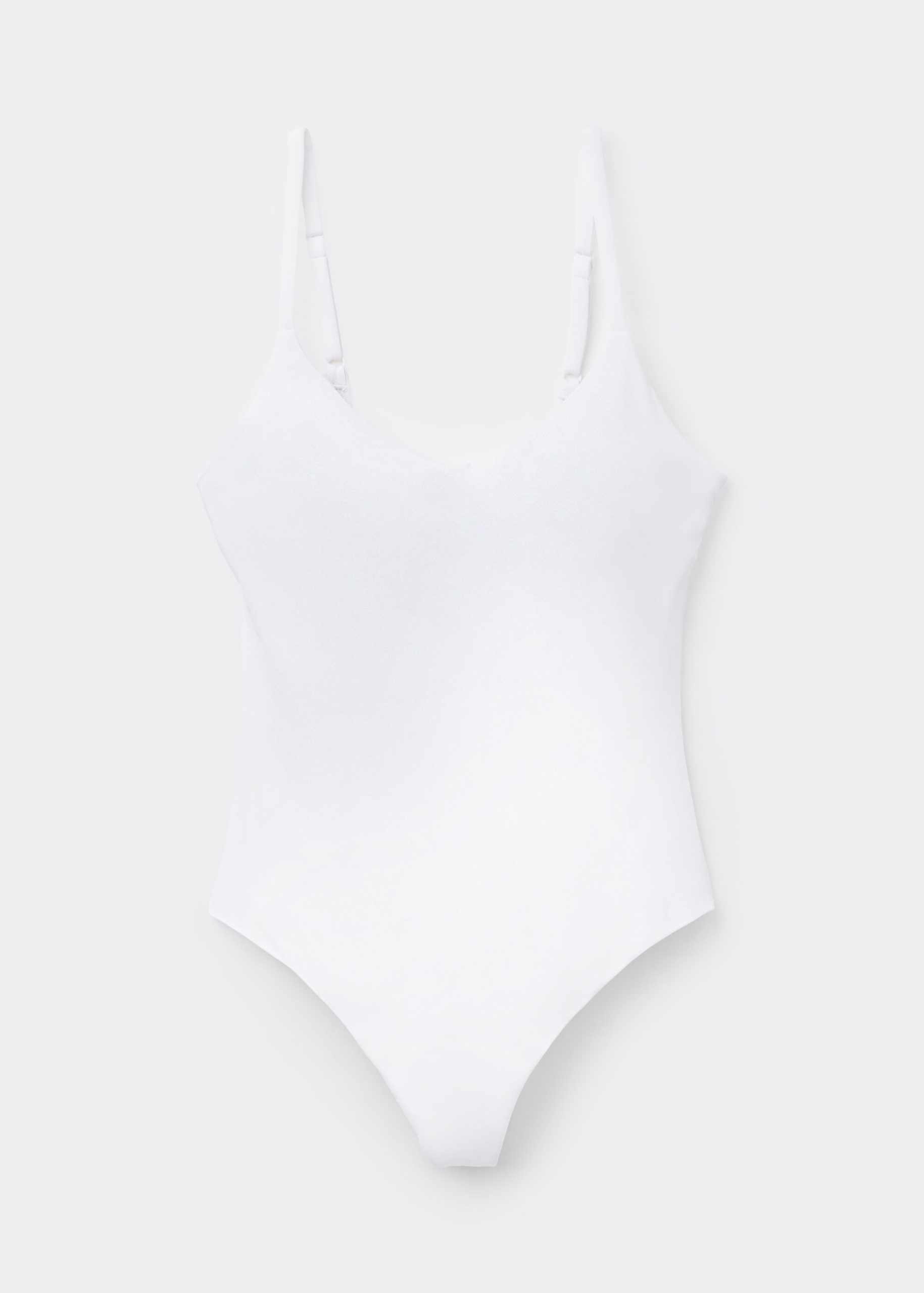 Low-cut one-piece swimsuit with lightly padded wireless cups. The extremely soft fabric makes it pleasant to wear, offering a light and comfortable feel on the skin. Adjustable thin straps. Fully lined in back with invisible seams. Light shaping effect on the abdomen. Regular bottom coverage in back.