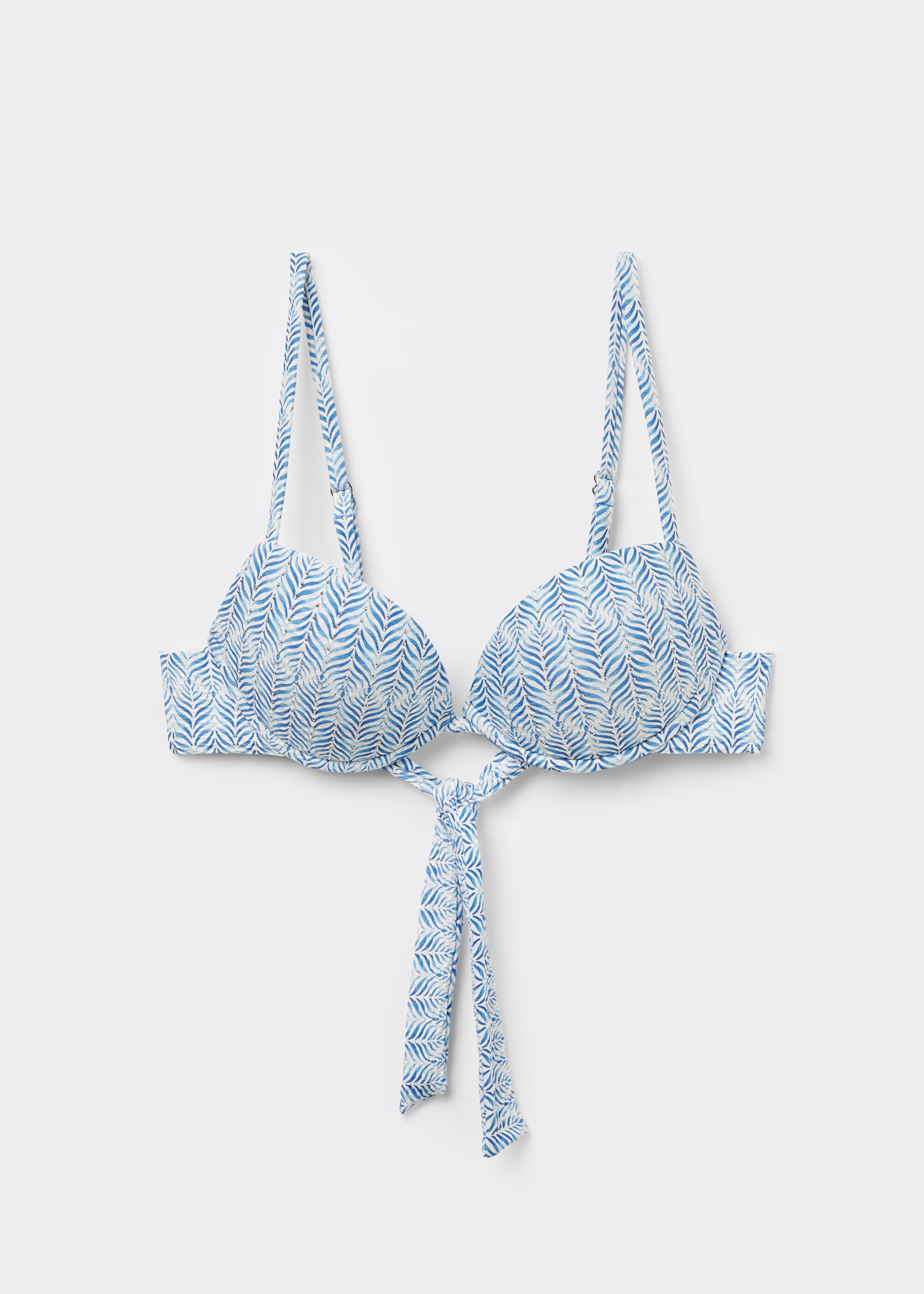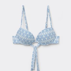 Push-up underwire bikini top with especially soft, graduated padded cups. A refined geometric pattern in delicate shades of white and blue, embellished by micro-beads that add a touch of elegance and sophistication. Adjustable straps and back tie closure.