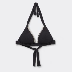Wireless fixed triangle bikini top with graduated padded cups that add volume to enhance the décolleté. The style features a crinkle fabric embellished with contrast color embroidery. The shoulder straps have eyelets on the ends so they can be hooked onto the back band or tied behind the neck. Back tie closure.