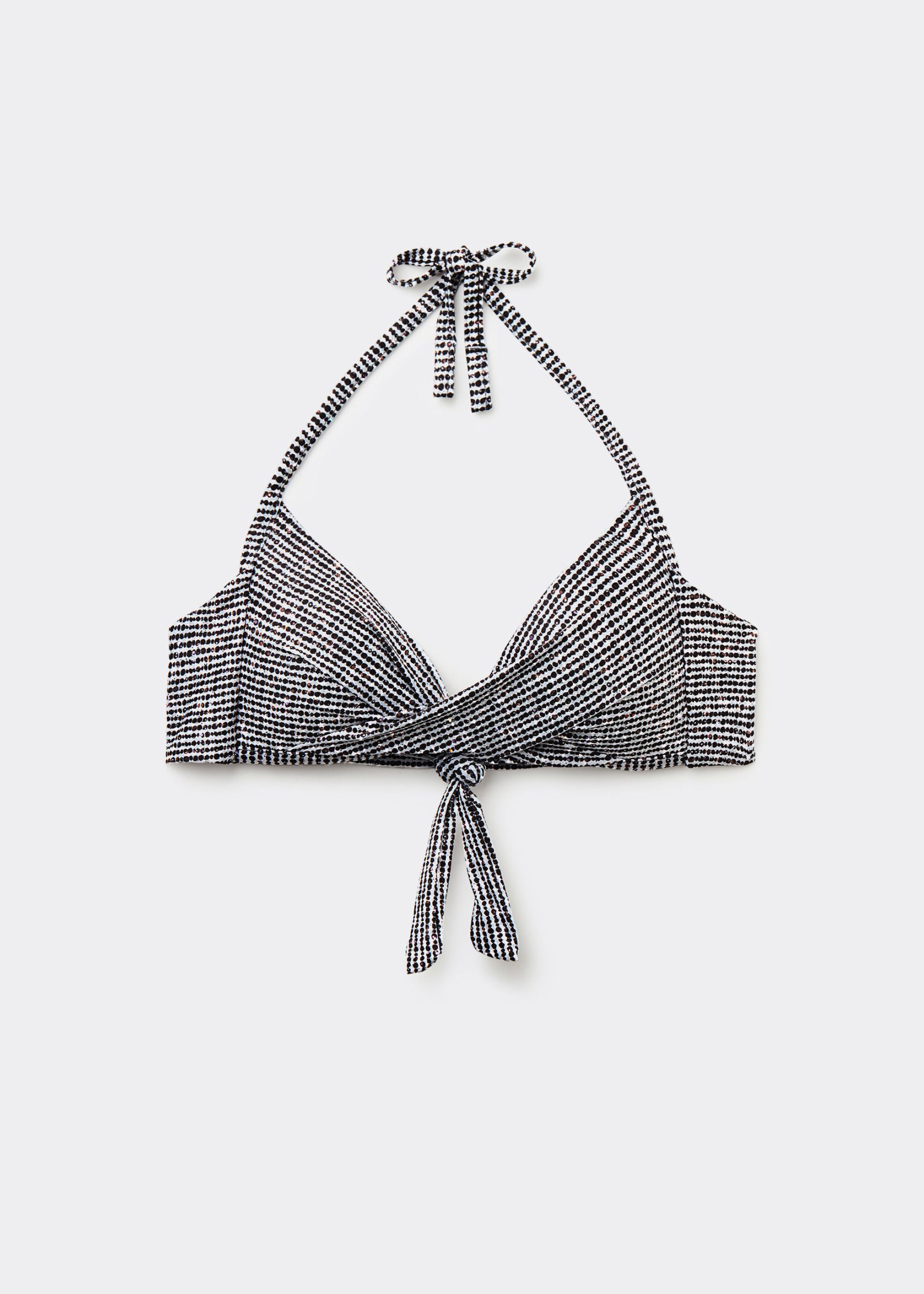 Fixed triangle bikini top with no underwire and graduated padded cups that add volume. The style features a black and white toned pattern embellished with a coated effect. The shoulder straps have eyelets on the ends so they can be hooked onto the back band or tied behind the neck. Back tie closure.