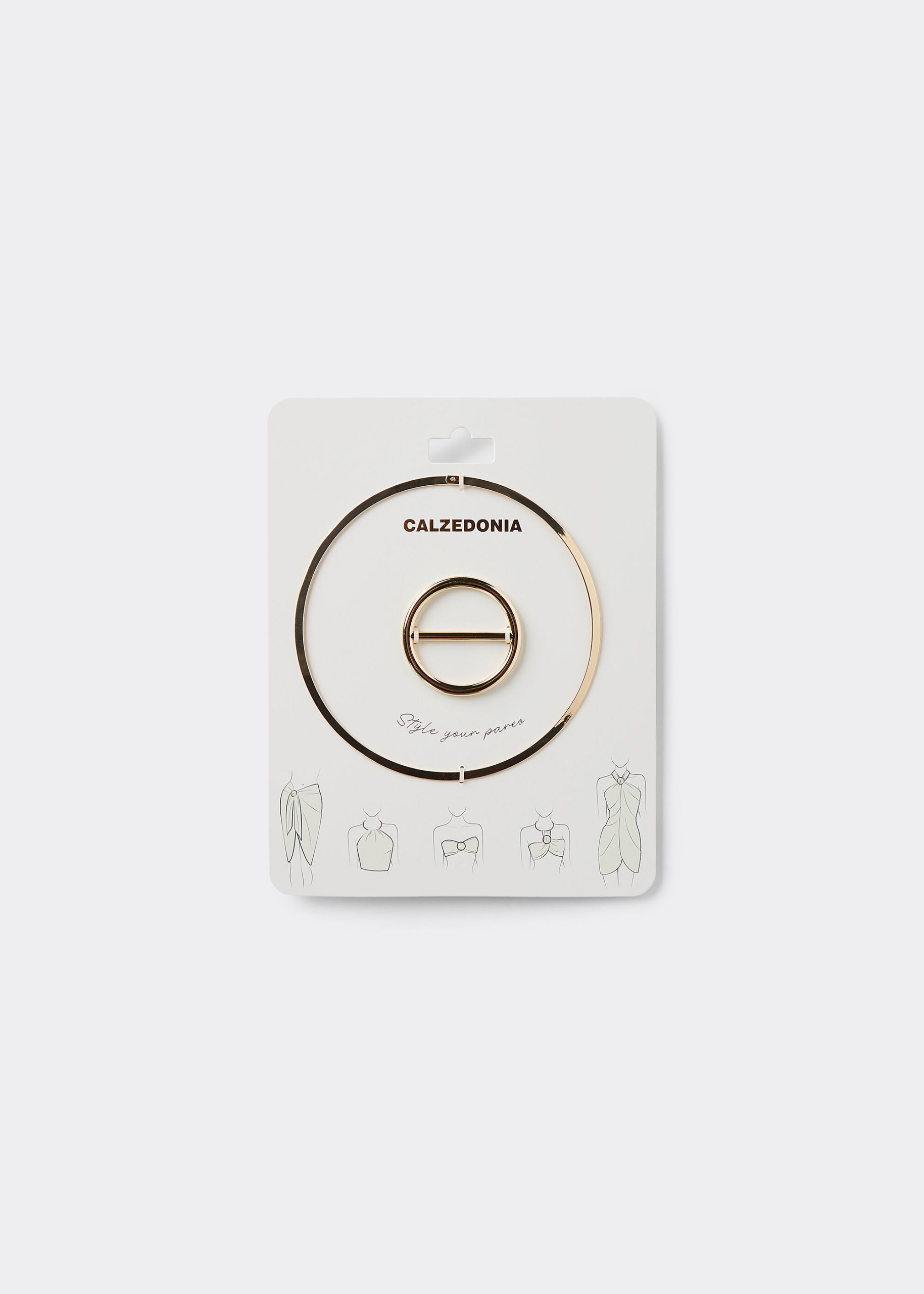 Pareo rings that include an elegant necklace ring to elegantly secure the pareo and a practical buckle-style ring to tie it at the waist or bust, offering many versatile and original solutions to create exclusive looks.