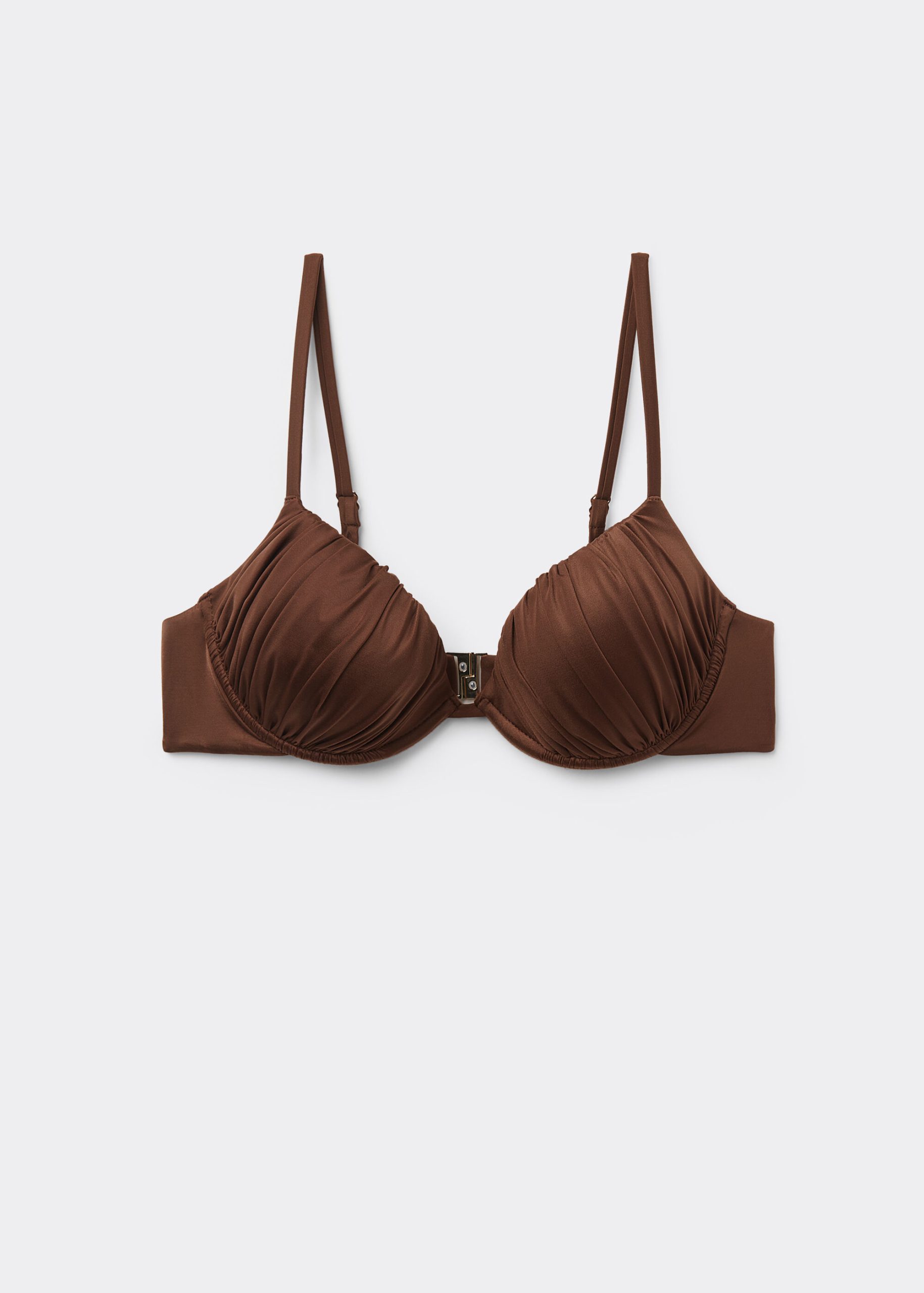 Push-up bikini top with lightly padded cups and underwire to guarantee support and provide volume. The style features a bright fabric with a silky effect. Fixed Shoulder Straps. Rear closure with double adjustment hook.