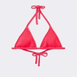Slide triangle bikini top with removable cups and no underwire for a natural effect. The style features a crinkle fabric with a three-dimensional effect. The shoulder straps have eyelets on the ends so they can be hooked onto the back band or tied behind the neck. Back string tie closure.