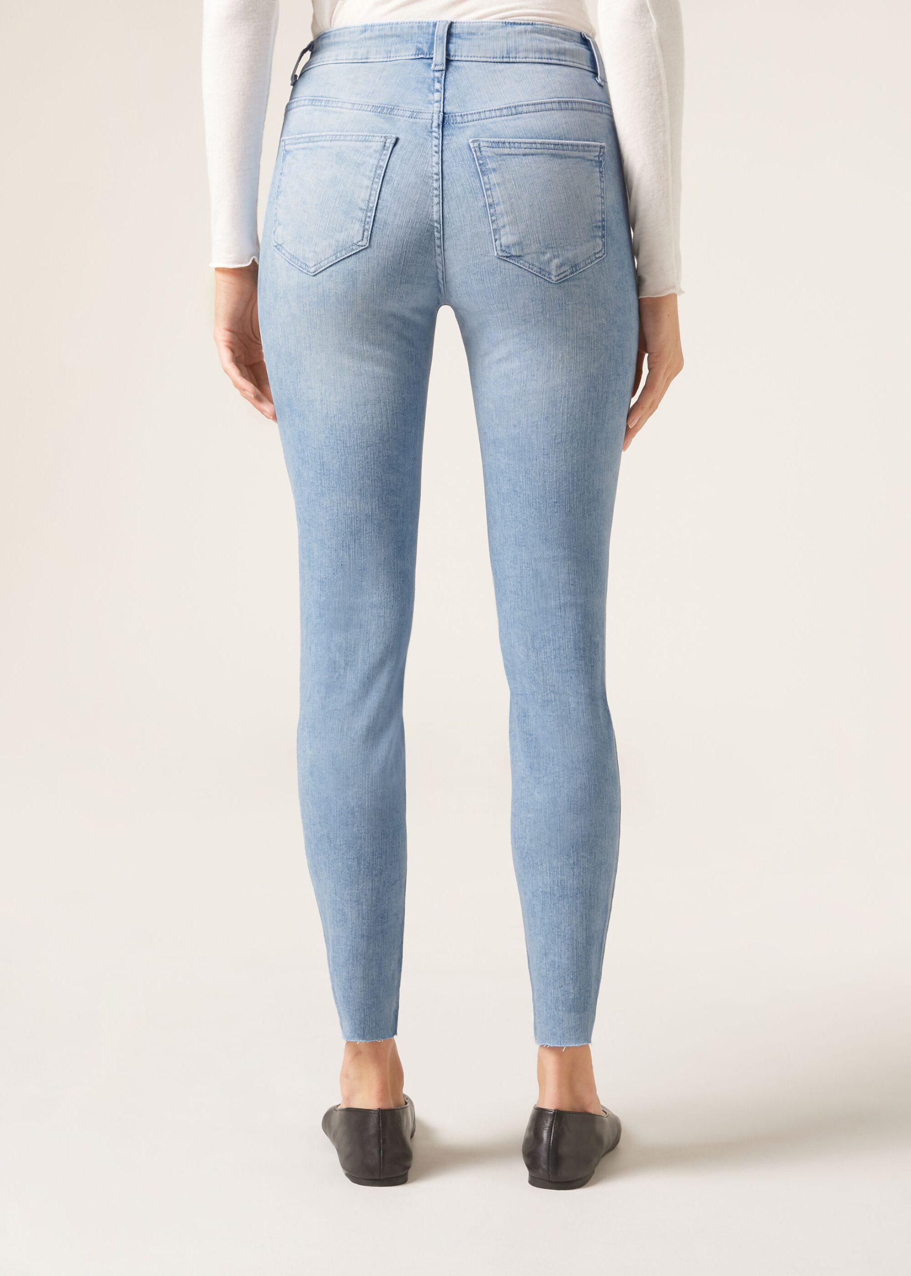 Women’s super skinny five pocket jeans with button fly and belt loops, made in especially comfortable, ultra stretch fabric. Lightly fringed raw edge hems.