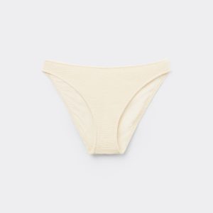 Fully lined bikini bottoms with invisible seams in a crinkle fabric with a three-dimensional effect. The slightly rounded waist allows it to be worn either as normal or with the legs higher to show off the physique.