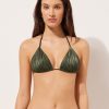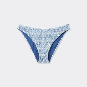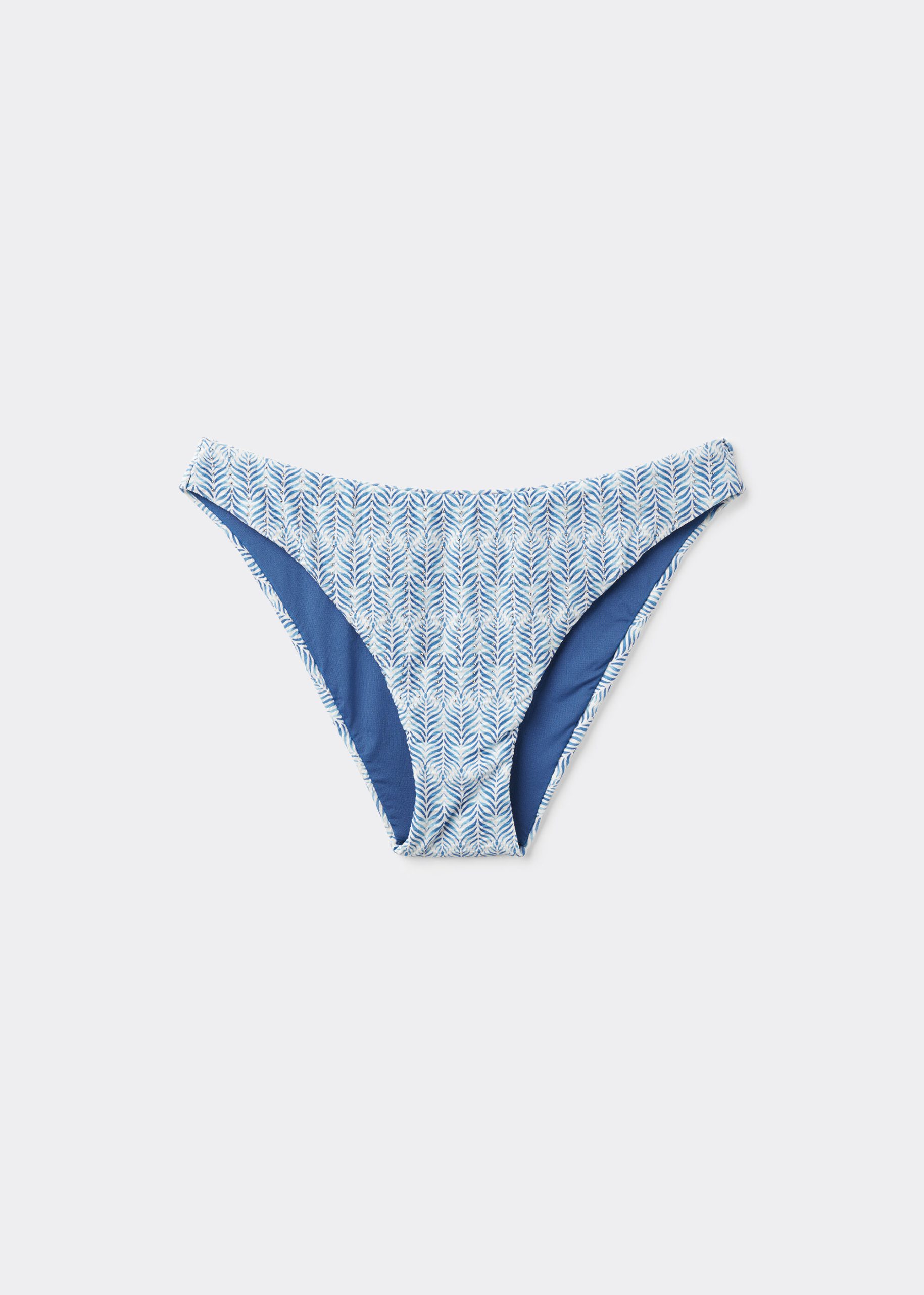 Fully lined bikini bottoms with invisible seams in order to not leave marks. The rounded waist at the front allows for both a classic or more high-cut fit, depending on one’s physique. A delicate geometric pattern in shades of white and blue, embellished by micro-beads that add a touch of elegance and sophistication.