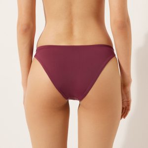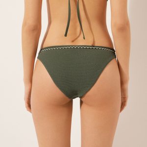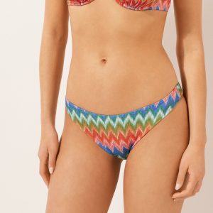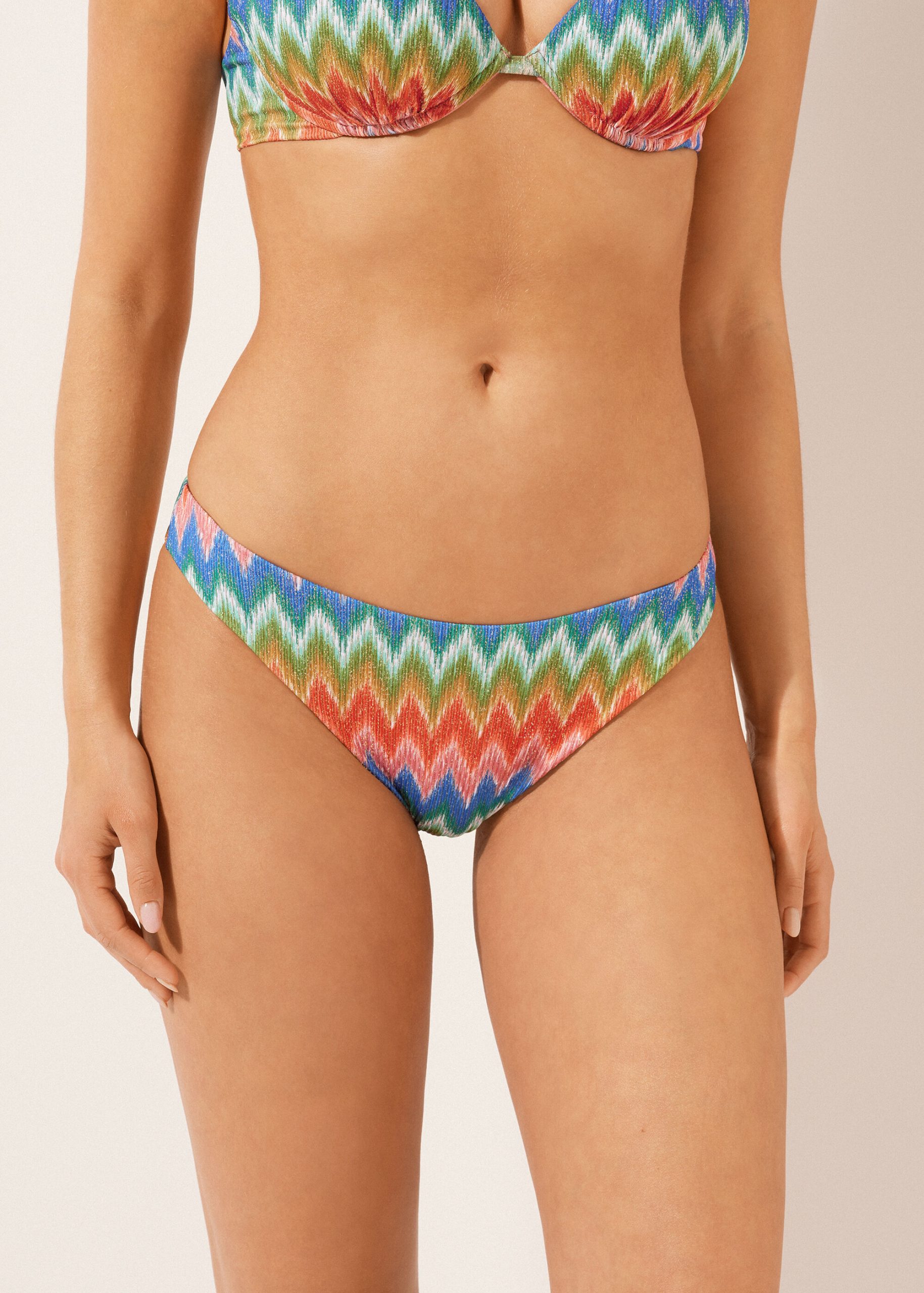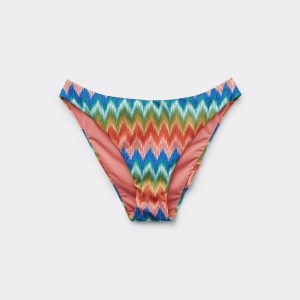 Fully lined bikini bottoms with invisible seams in order to not leave marks. The rounded waist at the front allows for both a classic or more high-cut fit, depending on one’s physique. A dynamic and sophisticated chevron motif, in bright colors on slightly ruched fabric, perfect for a modern and refined look.