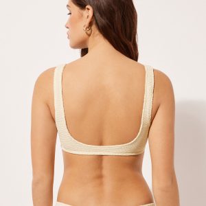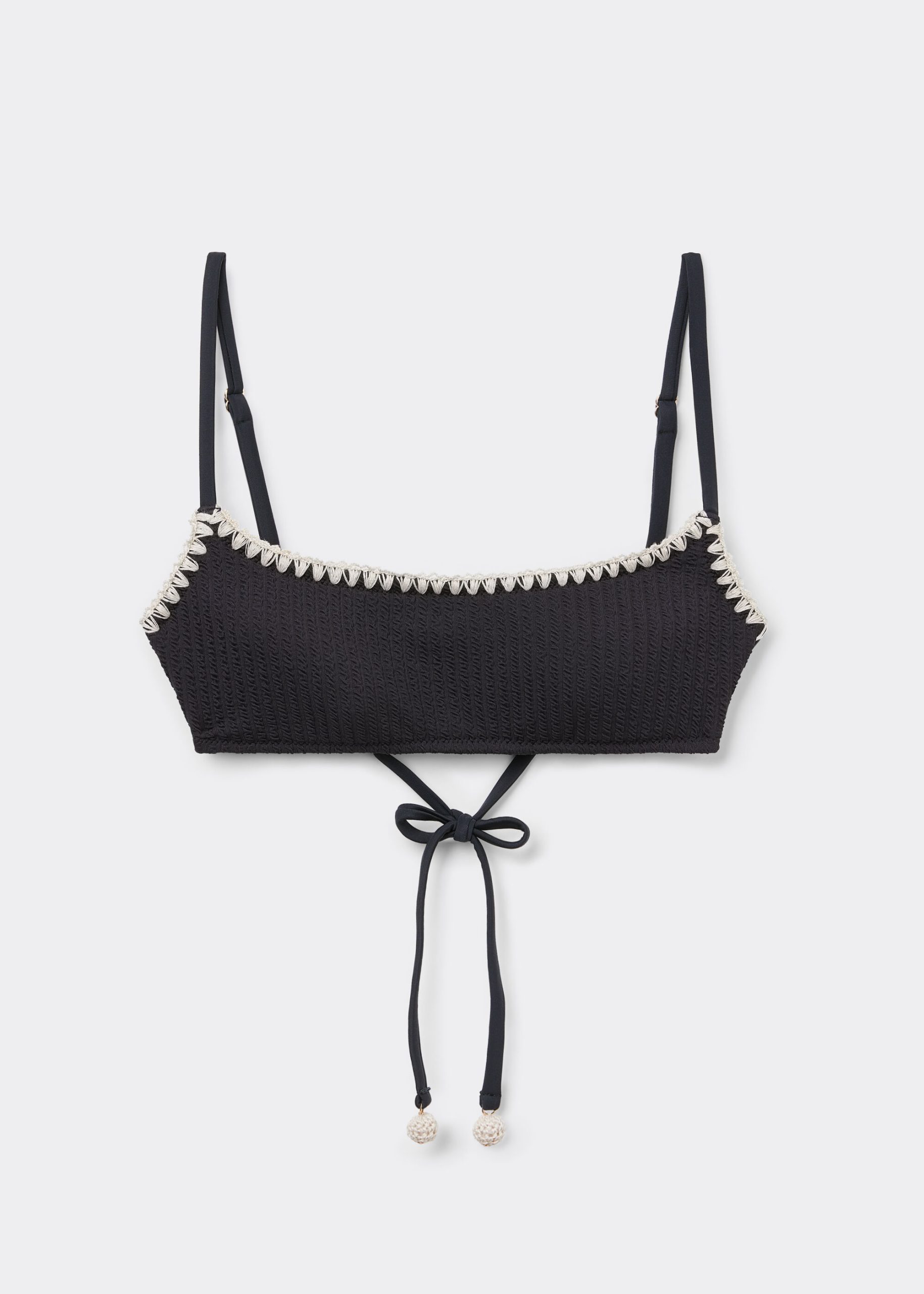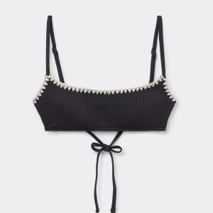 Wireless tank-style bikini top with lightly padded cups. The side boning helps support the bust. The style features a crinkle fabric embellished with contrast color embroidery. Adjustable straps and thin tie closure on the back.