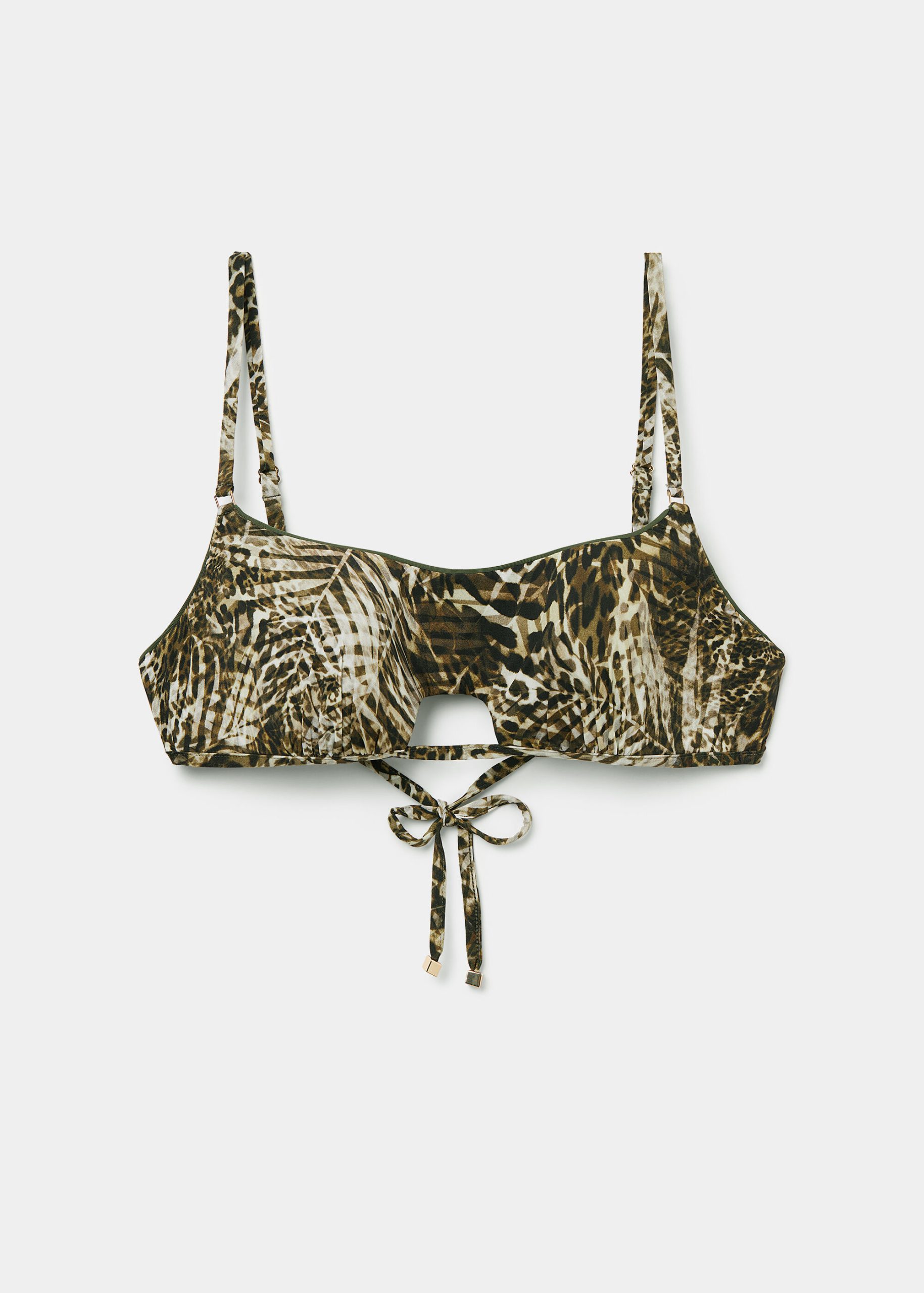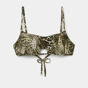 Wireless tank-style bikini top with lightly padded cups. The side boning helps support the bust. The style features an opening at the center of the bust. Reminiscent of animal print, the foliage pattern brings together exotic leaf designs with motifs that evoke markings from the animal world. Adjustable straps and thin tie closure on the back.