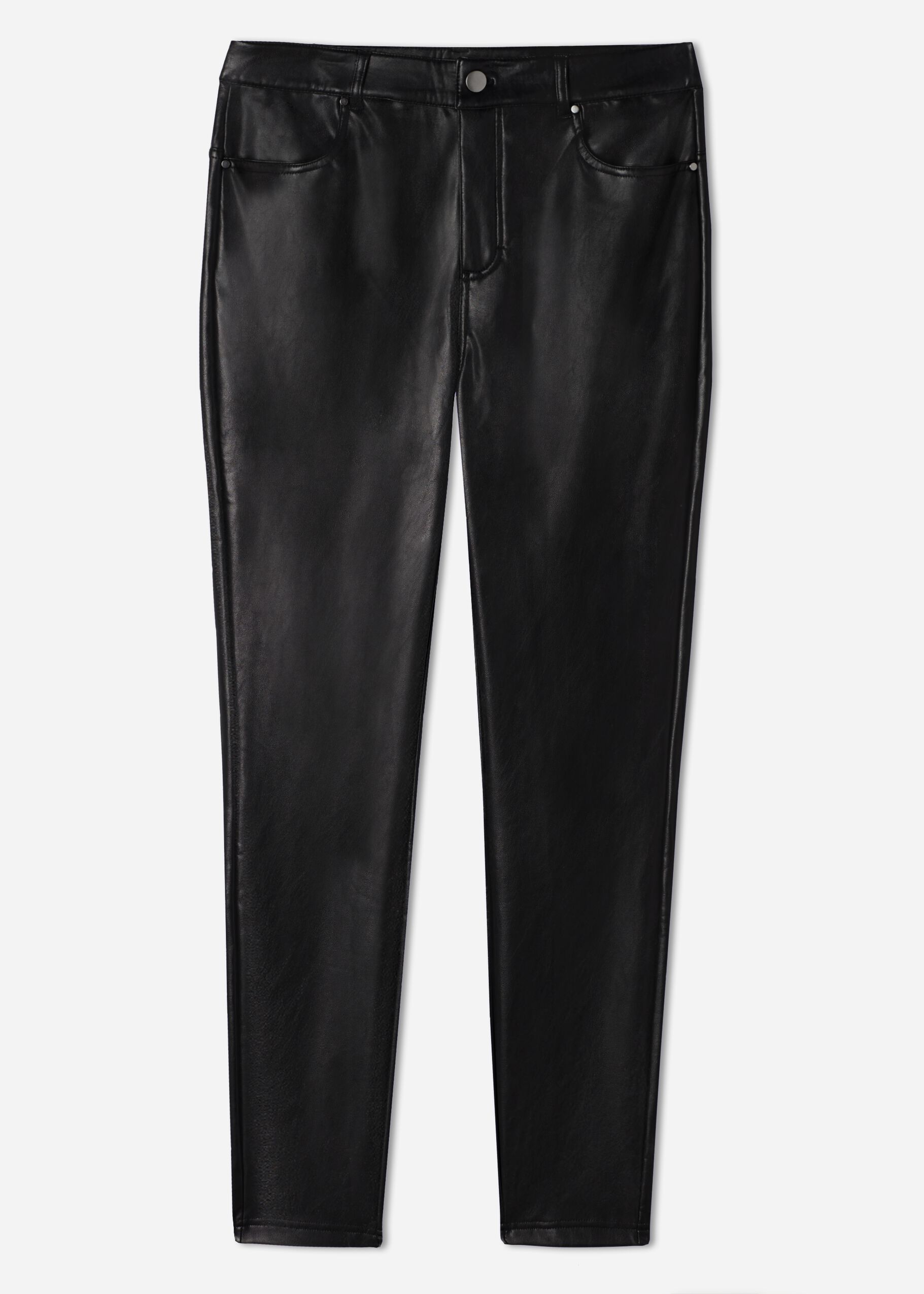 Leather-effect thermal pants with real pockets at back. Zip & button closure. Fleece insert inside.