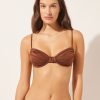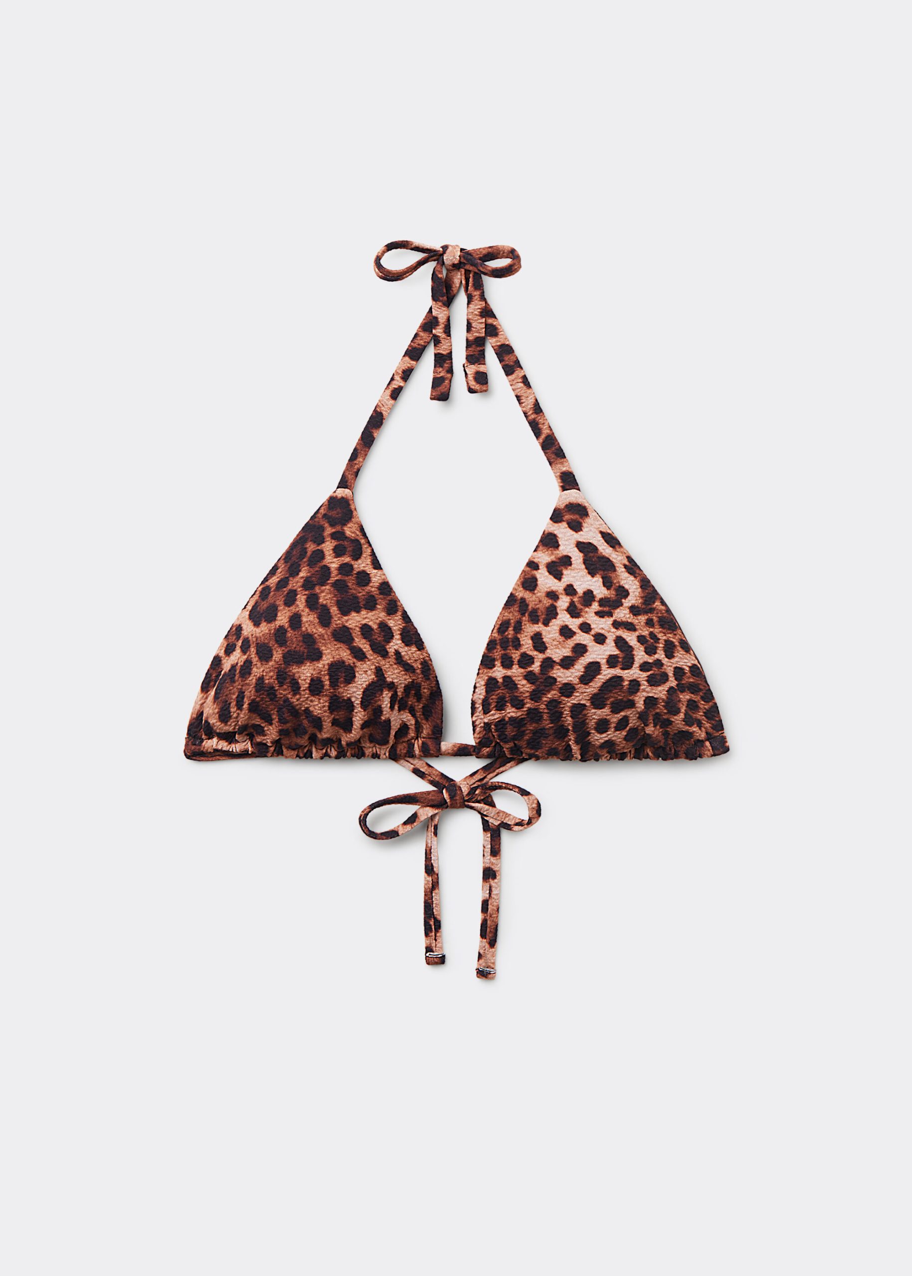 Slide triangle bikini top with removable padding, wireless for a natural effect. The style features an elegant animal pattern and lightly ruched fabric. The shoulder straps have eyelets on the ends so they can be hooked onto the back band or tied behind the neck. Back string tie closure.