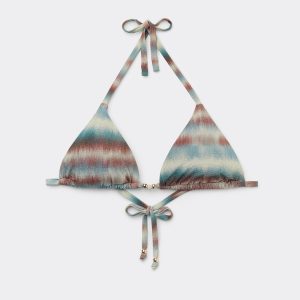 Slide triangle bikini top with removable padding, wireless for a natural effect. Bright and colorful tie-dye motif embellished with glittery details, on a soft and shimmery fabric, ideal for a bold and original look. The shoulder straps have eyelets on the ends so they can be hooked onto the back band or tied behind the neck. Back string tie closure.