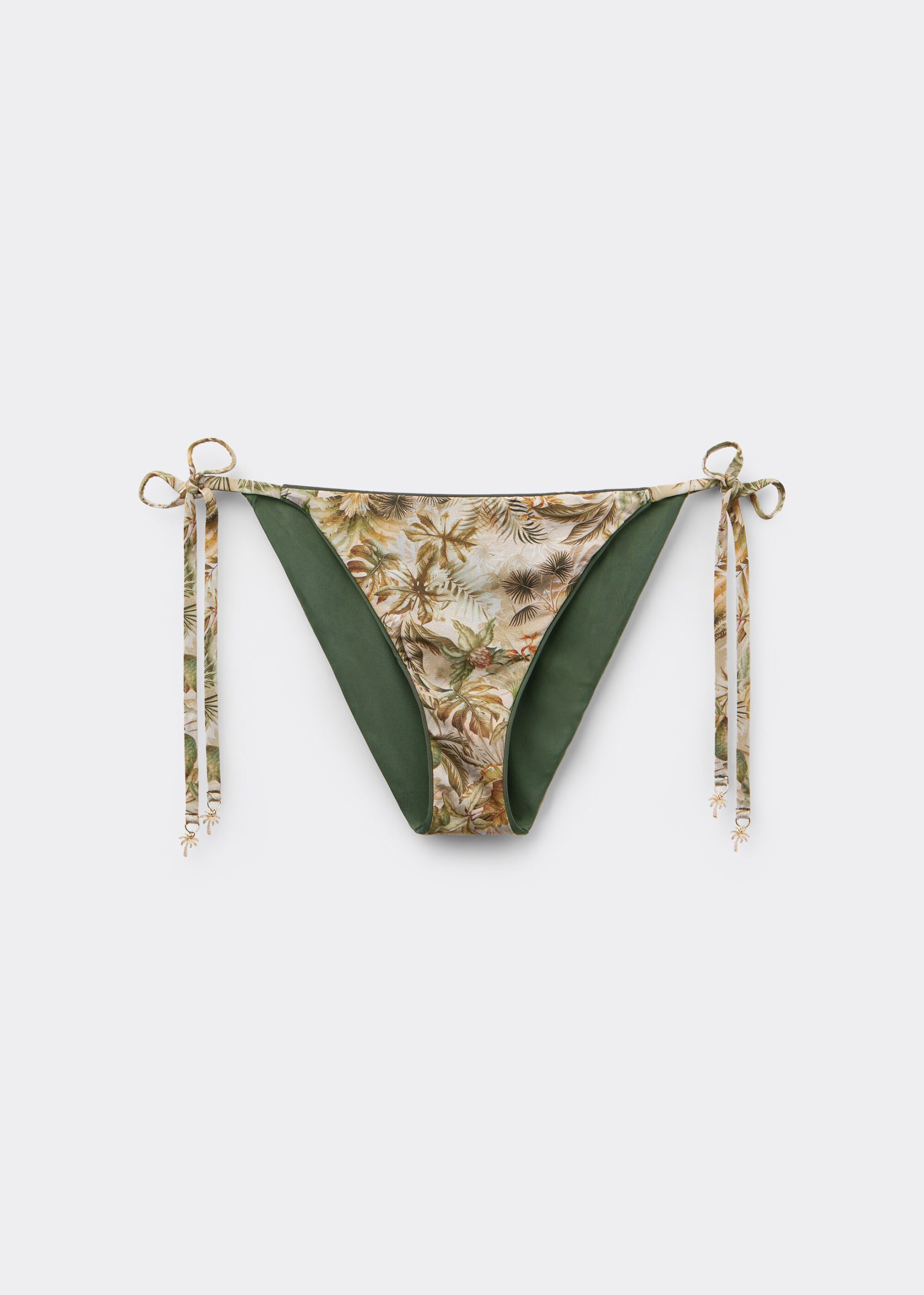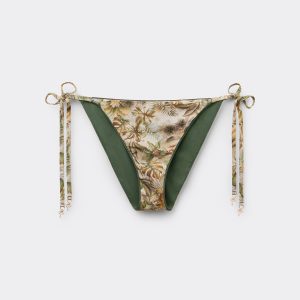 Bikini bottoms with thin side ties. The slightly rounded waist at the front allows for both a classic or more high-cut fit, depending on one’s physique. Made of soft microfiber with a refined foliage pattern. Fully lined with invisible seams.